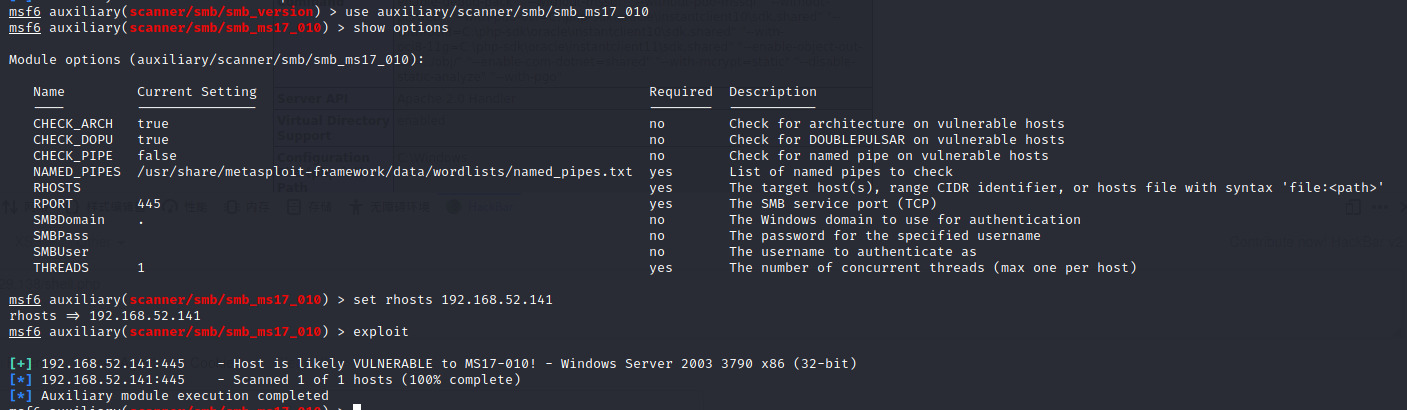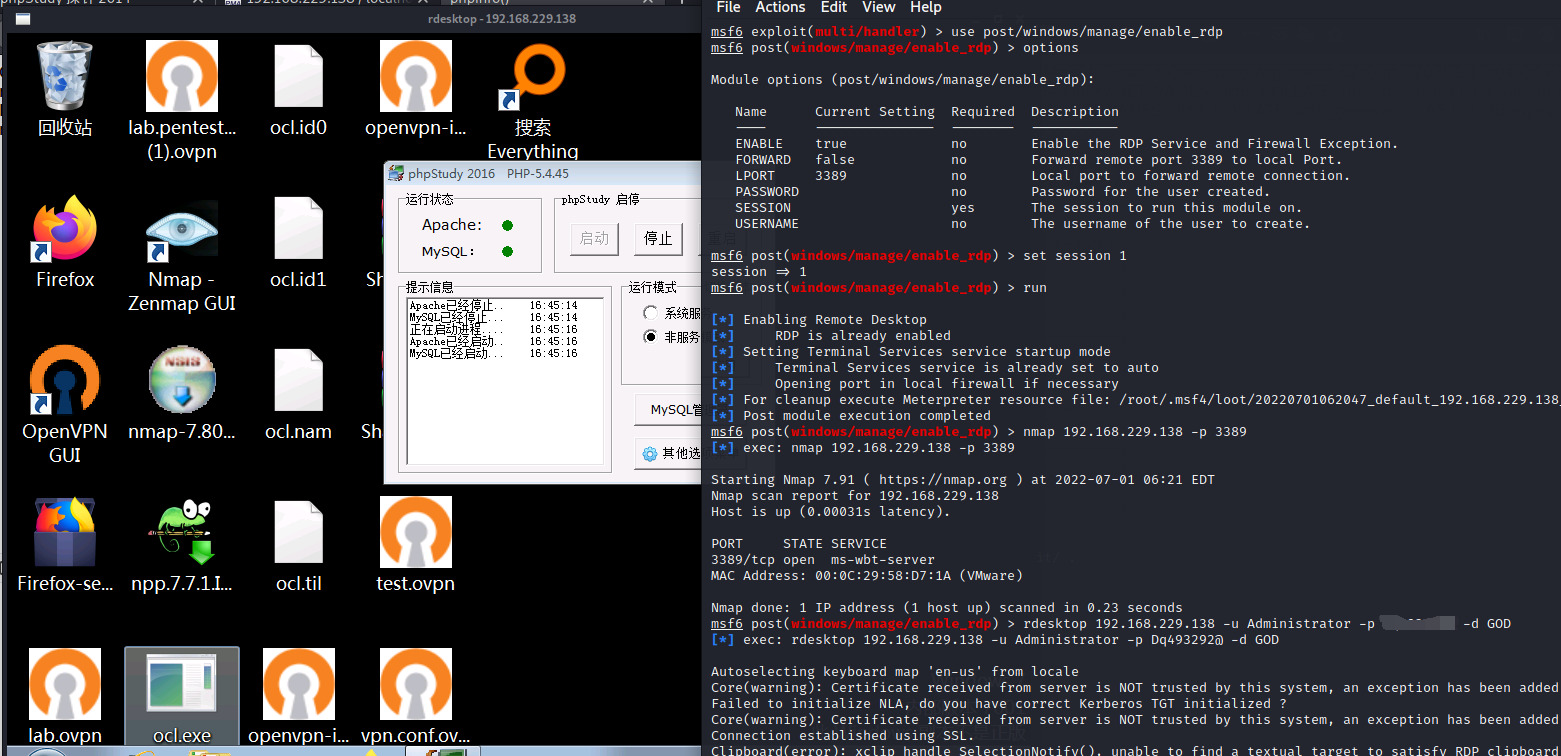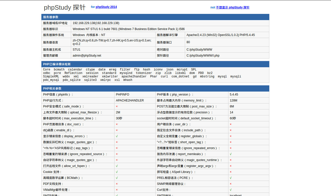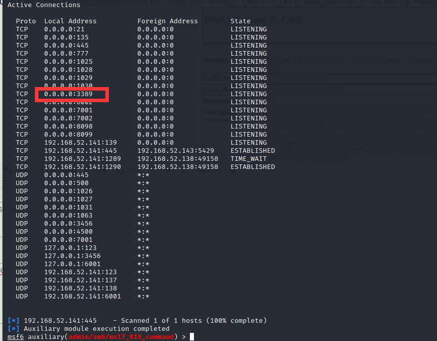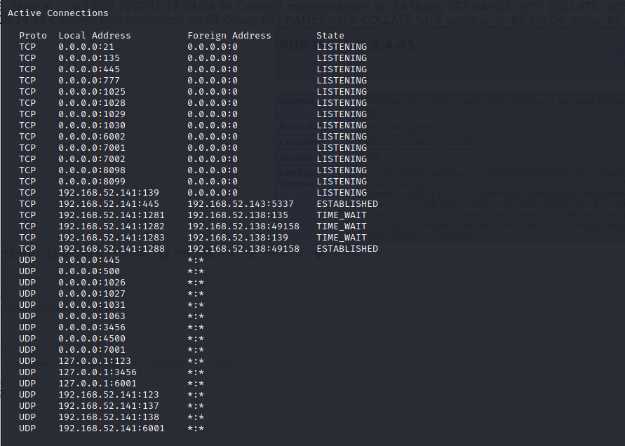 nmap -sS -sC -A -Pn -p- --min-rate 5000 192.168.229.138 Host discovery disabled (-Pn). All addresses will be marked 'up' and scan times will be slower. Starting Nmap 7.91 ( https://nmap.org ) at 2022-07-01 04:45 EDT Nmap scan report for 192.168.229.138 Host is up (0.00035s latency). Not shown: 65523 closed ports PORT STATE SERVICE VERSION 80/tcp open http Apache httpd 2.4.23 ((Win32) OpenSSL/1.0.2j PHP/5.4.45) |_http-server-header: Apache/2.4.23 (Win32) OpenSSL/1.0.2j PHP/5.4.45 |_http-title: phpStudy \xE6\x8E\xA2\xE9\x92\x88 2014 135/tcp open msrpc Microsoft Windows RPC 139/tcp open netbios-ssn Microsoft Windows netbios-ssn 445/tcp open microsoft-ds Windows 7 Professional 7601 Service Pack 1 microsoft-ds (workgroup: GOD) 1025/tcp open msrpc Microsoft Windows RPC 1026/tcp open msrpc Microsoft Windows RPC 1027/tcp open msrpc Microsoft Windows RPC 1028/tcp open msrpc Microsoft Windows RPC 1029/tcp open msrpc Microsoft Windows RPC 1030/tcp open msrpc Microsoft Windows RPC 3306/tcp open mysql MySQL (unauthorized) 3389/tcp open tcpwrapped | ssl-cert: Subject: commonName=stu1.god.org | Not valid before: 2022-06-29T05:13:38 |_Not valid after: 2022-12-29T05:13:38 |_ssl-date: 2022-07-01T08:46:49+00:00; -2s from scanner time. MAC Address: 00:0C:29:58:D7:1A (VMware) Device type: general purpose Running: Microsoft Windows 7|2008|8.1 OS CPE: cpe:/o:microsoft:windows_7::- cpe:/o:microsoft:windows_7::sp1 cpe:/o:microsoft:windows_server_2008::sp1 cpe:/o:microsoft:windows_server_2008:r2 cpe:/o:microsoft:windows_8 cpe:/o:microsoft:windows_8.1 OS details: Microsoft Windows 7 SP0 - SP1, Windows Server 2008 SP1, Windows Server 2008 R2, Windows 8, or Windows 8.1 Update 1 Network Distance: 1 hop Service Info: Host: STU1; OS: Windows; CPE: cpe:/o:microsoft:windows