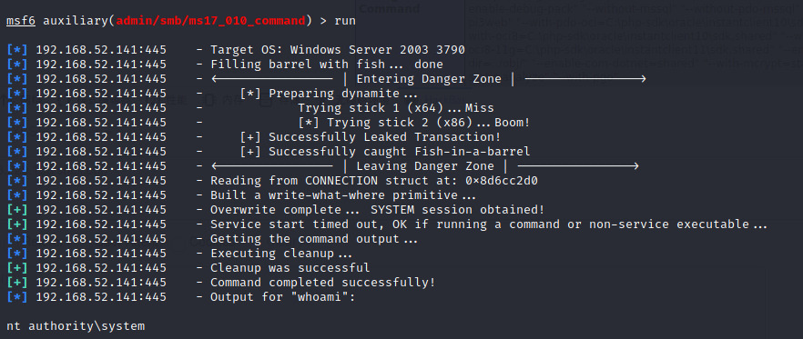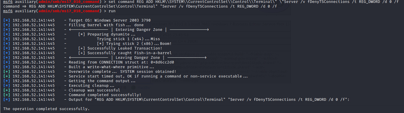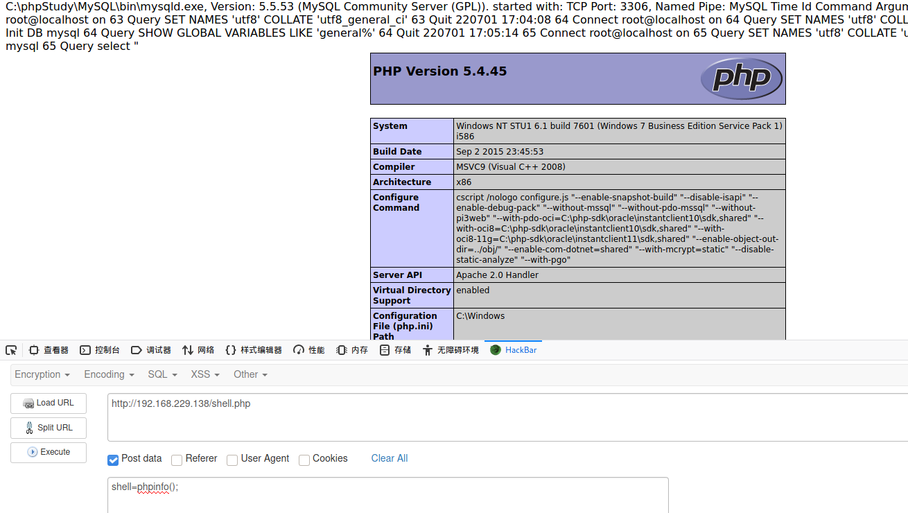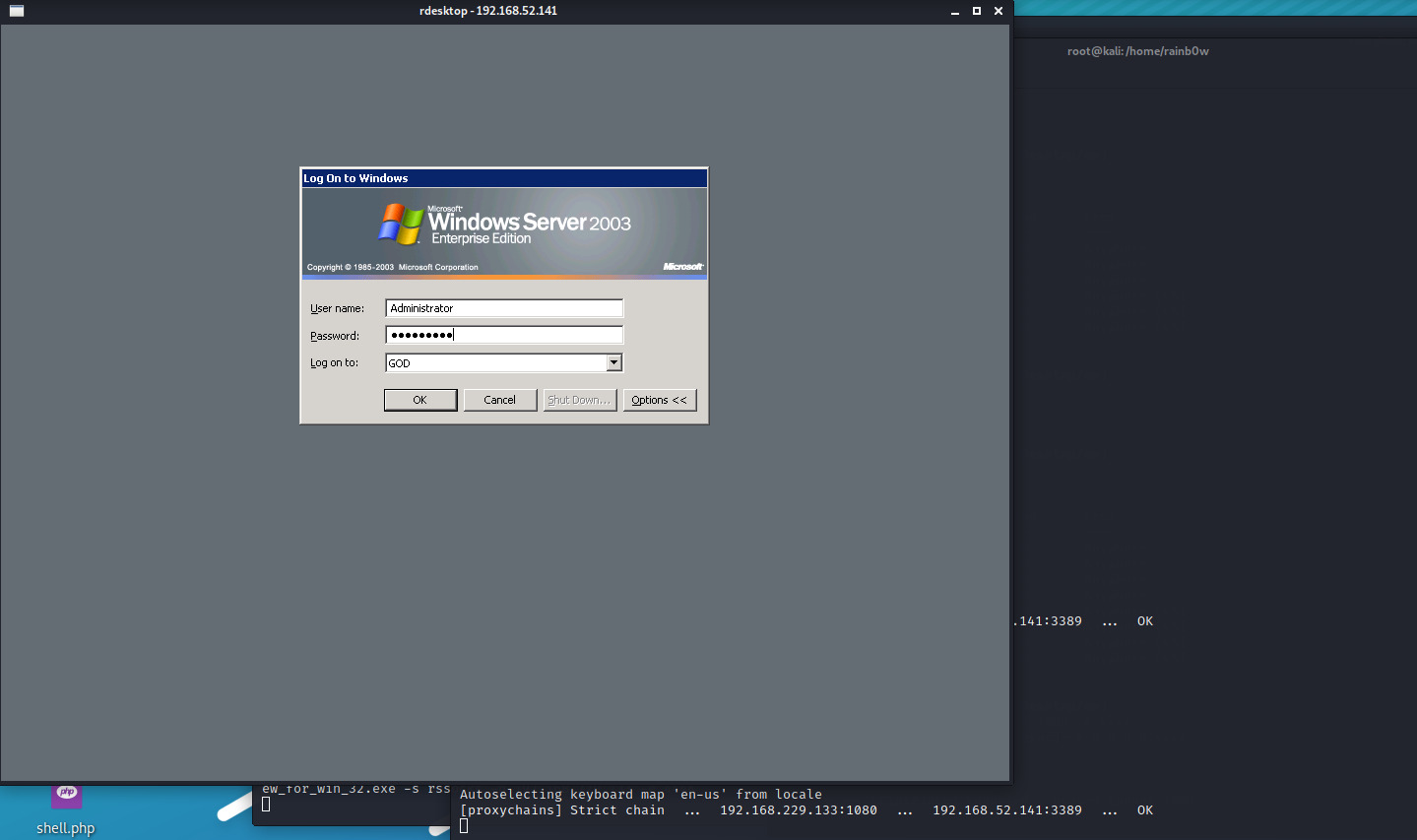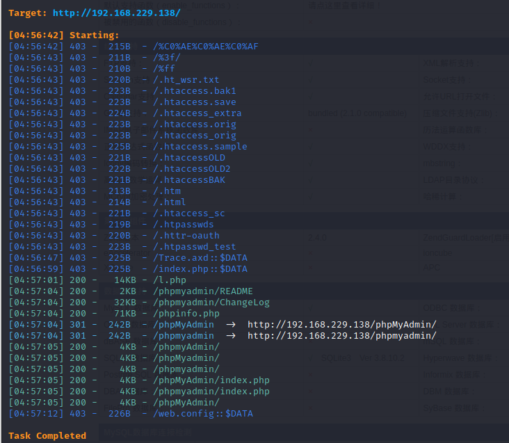 nmap -sS -sC -A -Pn -p- --min-rate 5000 192.168.229.138 Host discovery disabled (-Pn). All addresses will be marked 'up' and scan times will be slower. Starting Nmap 7.91 ( https://nmap.org ) at 2022-07-01 04:45 EDT Nmap scan report for 192.168.229.138 Host is up (0.00035s latency). Not shown: 65523 closed ports PORT STATE SERVICE VERSION 80/tcp open http Apache httpd 2.4.23 ((Win32) OpenSSL/1.0.2j PHP/5.4.45) |_http-server-header: Apache/2.4.23 (Win32) OpenSSL/1.0.2j PHP/5.4.45 |_http-title: phpStudy \xE6\x8E\xA2\xE9\x92\x88 2014 135/tcp open msrpc Microsoft Windows RPC 139/tcp open netbios-ssn Microsoft Windows netbios-ssn 445/tcp open microsoft-ds Windows 7 Professional 7601 Service Pack 1 microsoft-ds (workgroup: GOD) 1025/tcp open msrpc Microsoft Windows RPC 1026/tcp open msrpc Microsoft Windows RPC 1027/tcp open msrpc Microsoft Windows RPC 1028/tcp open msrpc Microsoft Windows RPC 1029/tcp open msrpc Microsoft Windows RPC 1030/tcp open msrpc Microsoft Windows RPC 3306/tcp open mysql MySQL (unauthorized) 3389/tcp open tcpwrapped | ssl-cert: Subject: commonName=stu1.god.org | Not valid before: 2022-06-29T05:13:38 |_Not valid after: 2022-12-29T05:13:38 |_ssl-date: 2022-07-01T08:46:49+00:00; -2s from scanner time. MAC Address: 00:0C:29:58:D7:1A (VMware) Device type: general purpose Running: Microsoft Windows 7|2008|8.1 OS CPE: cpe:/o:microsoft:windows_7::- cpe:/o:microsoft:windows_7::sp1 cpe:/o:microsoft:windows_server_2008::sp1 cpe:/o:microsoft:windows_server_2008:r2 cpe:/o:microsoft:windows_8 cpe:/o:microsoft:windows_8.1 OS details: Microsoft Windows 7 SP0 - SP1, Windows Server 2008 SP1, Windows Server 2008 R2, Windows 8, or Windows 8.1 Update 1 Network Distance: 1 hop Service Info: Host: STU1; OS: Windows; CPE: cpe:/o:microsoft:windows